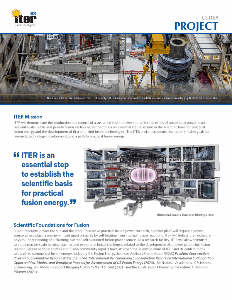 ITER will demonstrate the production and control of a sustained fusion power source for hundreds of seconds at power-plant relevant scale. Public and private fusion sectors agree that this is an essential step to establish the scientific basis for practical fusion energy and the development of first-of-a-kind fusion technologies. The ITER project crosscuts the nation’s fusion goals for research, technology development, and a path to practical fusion energy.